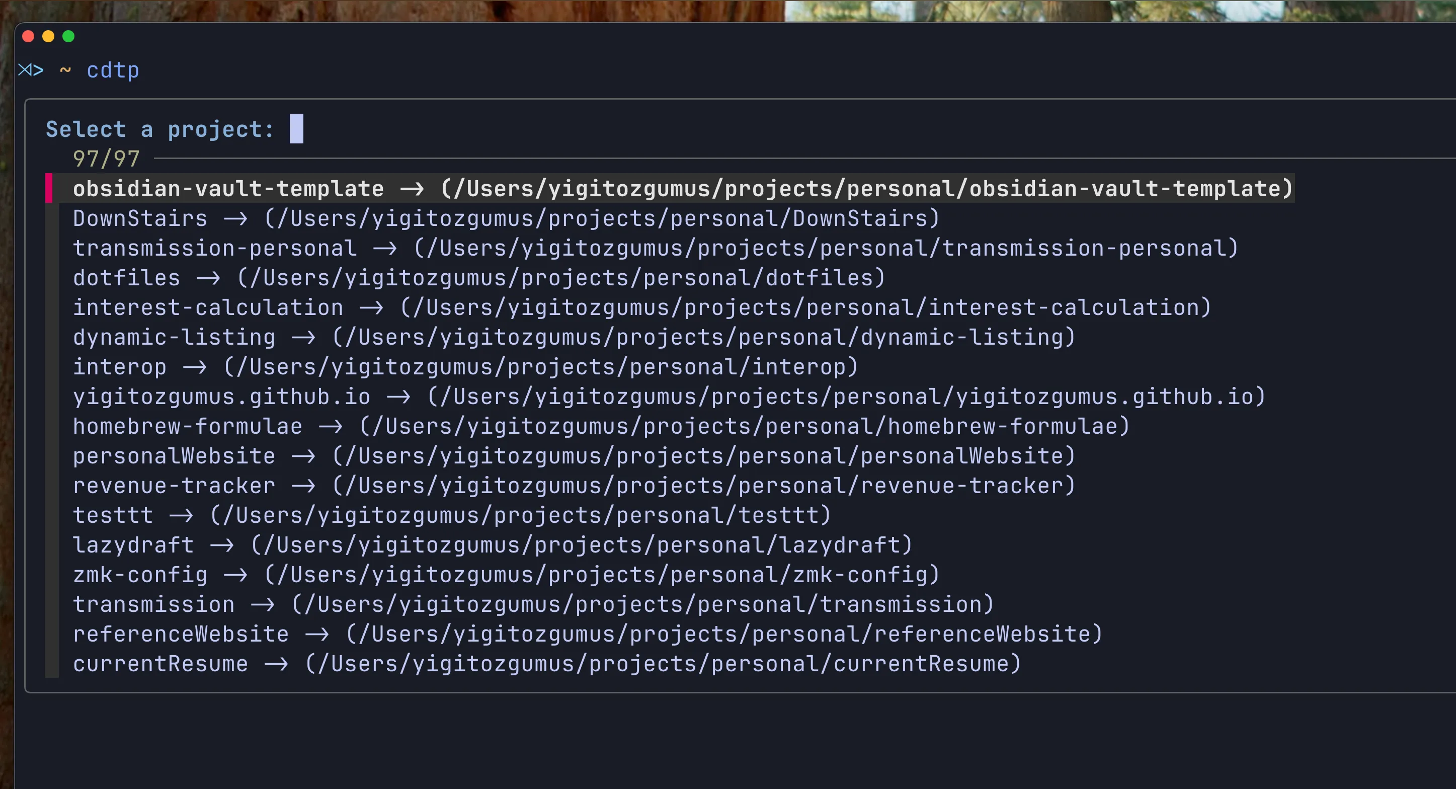 Function gets the project list from multiple sources and presents them in a readable format. Once selected, it cd’s to that location, hence the name: cdtp, cd to project.