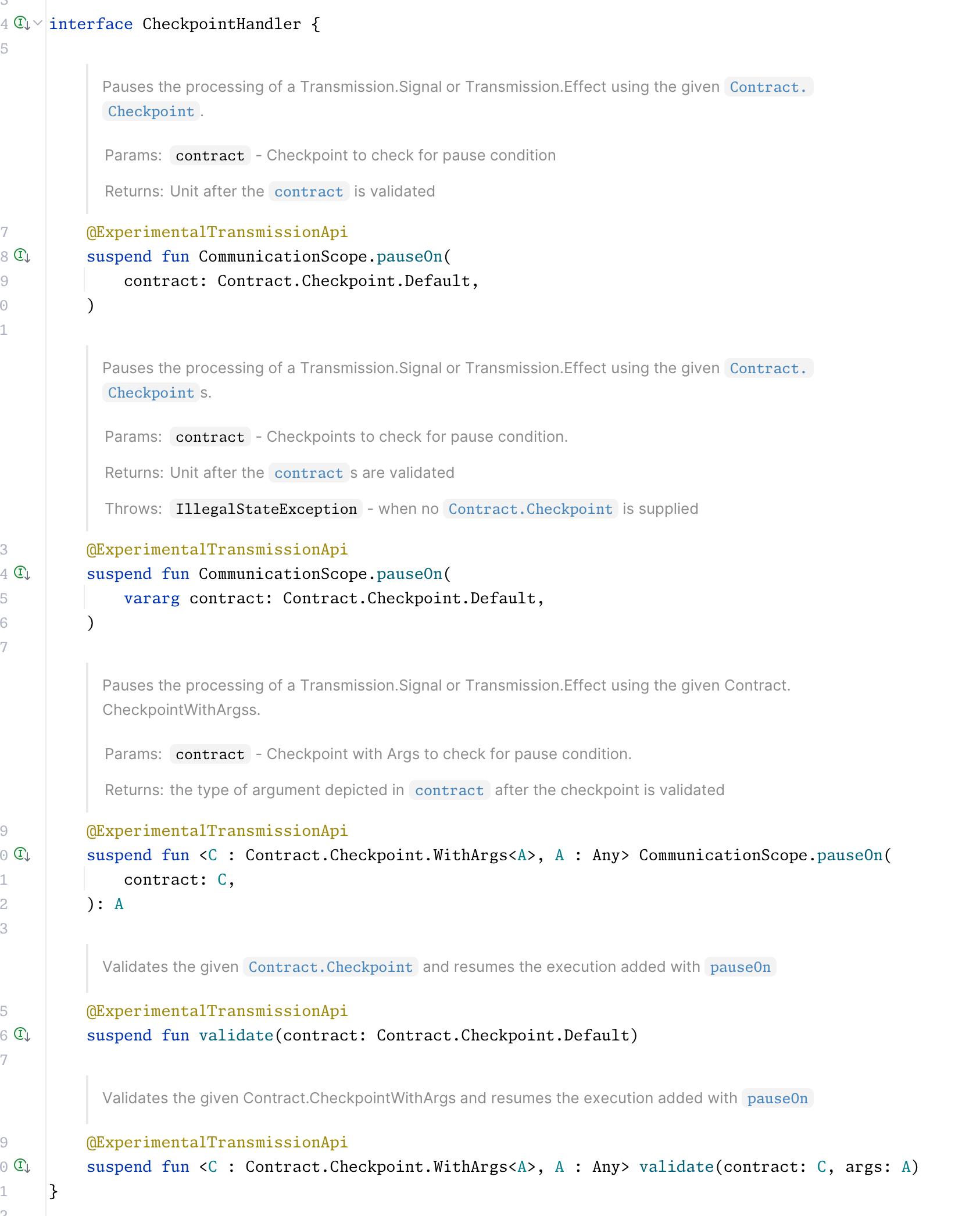 @ExperimentalTransmissionApioverride suspend fun CommunicationScope.pauseOn( contract: Contract.Checkpoint.Default) { val queryIdentifier = IdentifierGenerator.generateIdentifier() suspendCancellableCoroutine<Unit> { continuation -> val validator = object : CheckpointValidator<Contract.Checkpoint.Default, Unit> { override suspend fun validate( contract: Contract.Checkpoint.Default, args: Unit ): Boolean { continuation.resume(Unit) return true } } checkpointTrackerProvider()?.run { registerContract(contract, queryIdentifier) putOrCreate(queryIdentifier, validator) }}When we need execution to continue, target interaction might trigger the checkpoint using its Contract. If the conditions of the checkpoints are validated, we remove them from the tracker and continue the execution.