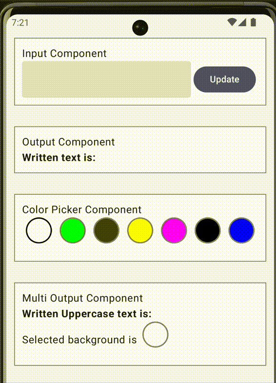 override val handlers: Handlers = createHandlers { onSignal<InputSignal.InputUpdate> { signal -> holder.update { it.copy(writtenText = signal.value) } publish(effect = InputEffect.InputUpdate(signal.value)) } onEffect<ColorPickerEffect.BackgroundColorUpdate> { effect -> holder.update { it.copy(backgroundColor = effect.color) } }}