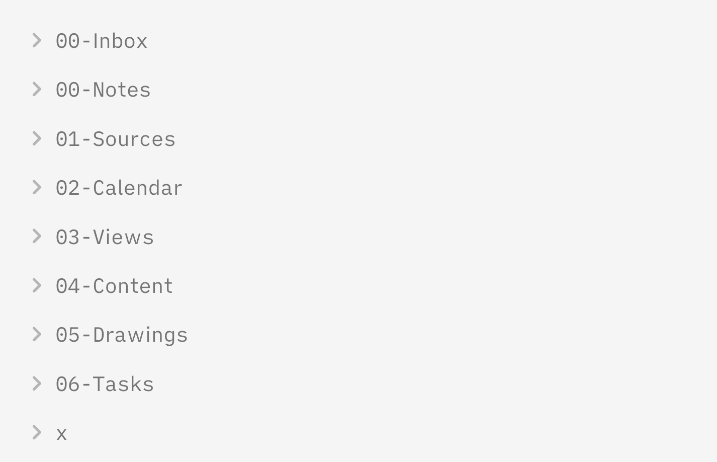 05-Drawings keeps all of the non-text notes like Excalidraw and Canvas. 06-Tasks keeps all of the task notes which we will delve deep in the next section. x is the central maintenance area. It keeps the assets, templates and some scripts I use for the automation.