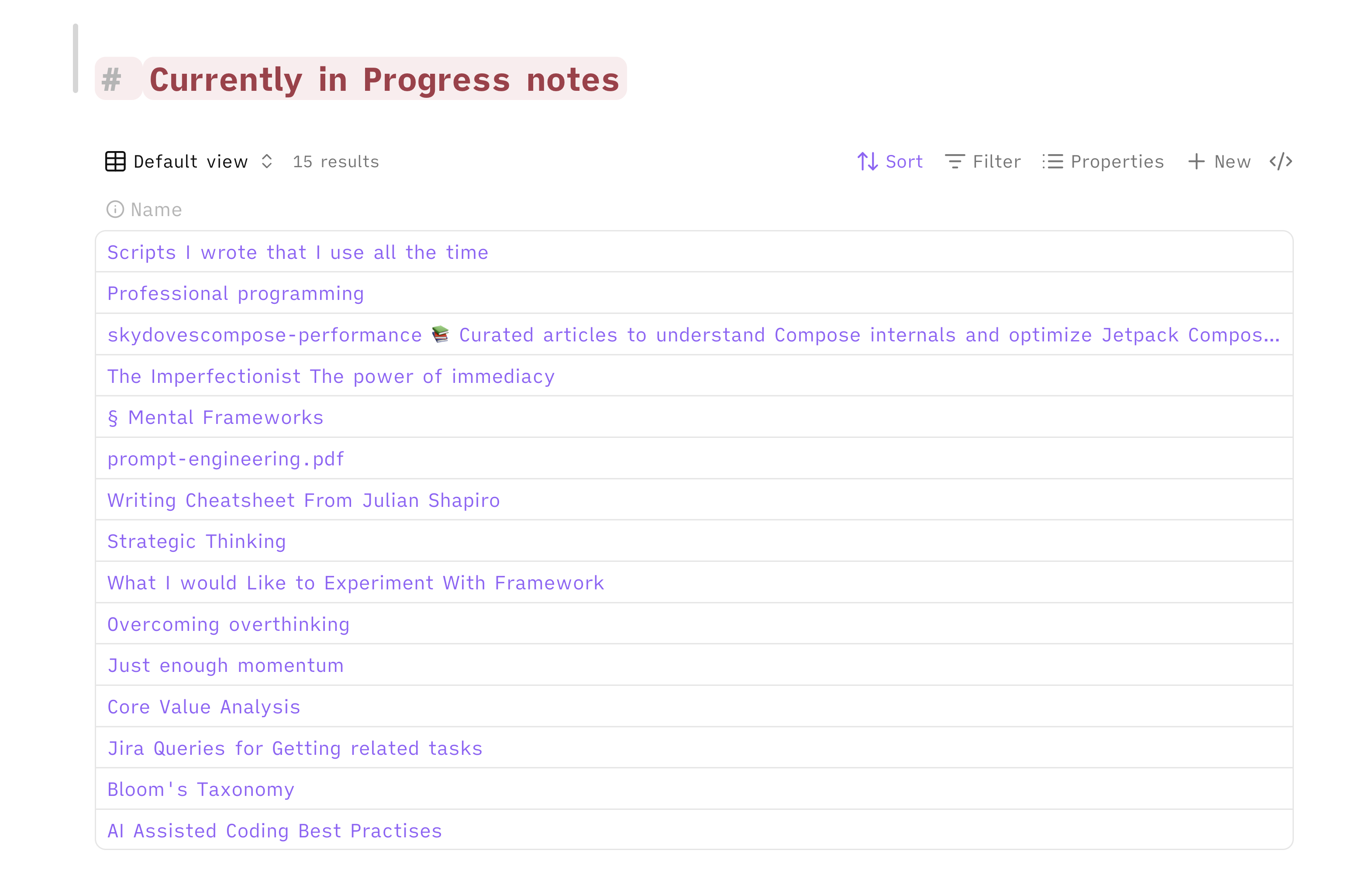 <%tp.file.cursor()%>Since almost every note has this properties, I could easily create query pages for each of them. This makes it really easy to see what types of things are “Active”, or “Waiting” in my vault.