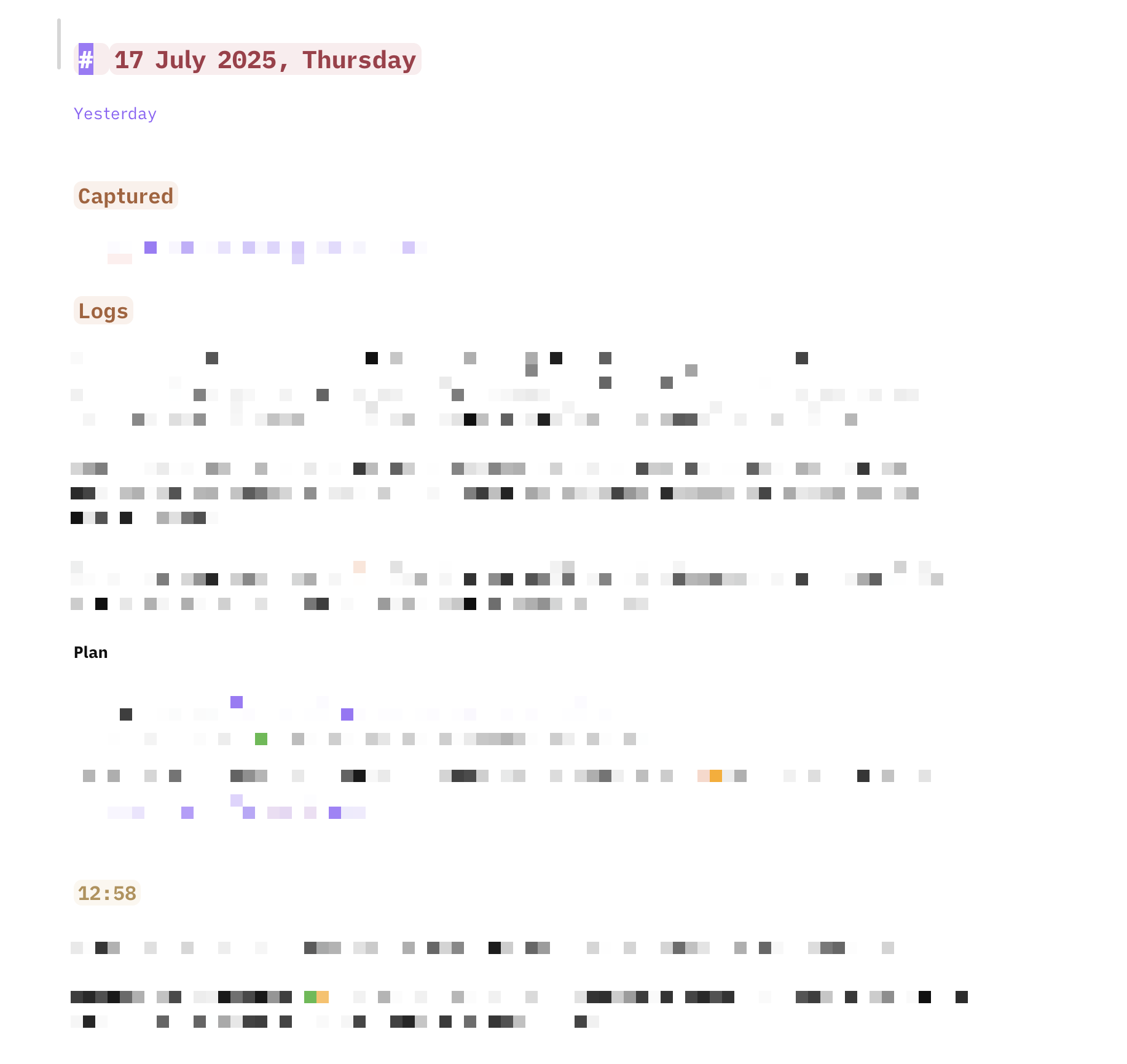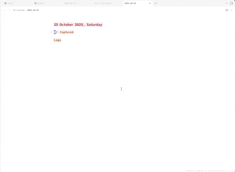 There are couple of small template shortcuts that makes easier to insert time stamp. Other than that the format is just what it needs to be that day. Also, a neat small automation I’ve added using Quick-add plugin is to link the notes I want to the current daily note. When I want to create another note but keep some form of reference in the daily note, I use this.