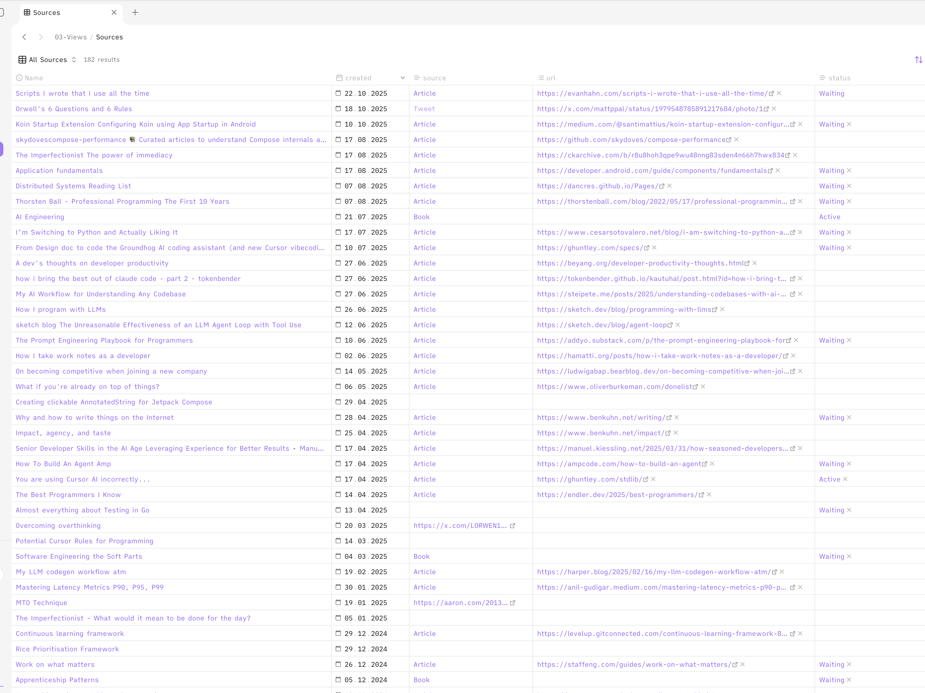 00-Notes is the main notes area. Almost anything goes here. 01-Sources keeps the external information. I save some of the articles I would like to revisit again using Obsidian Web Clipper. There are also Book notes, Videos and all sorts of information. I keep a note called Sources to query this folder using Obsidian’s Bases feature.