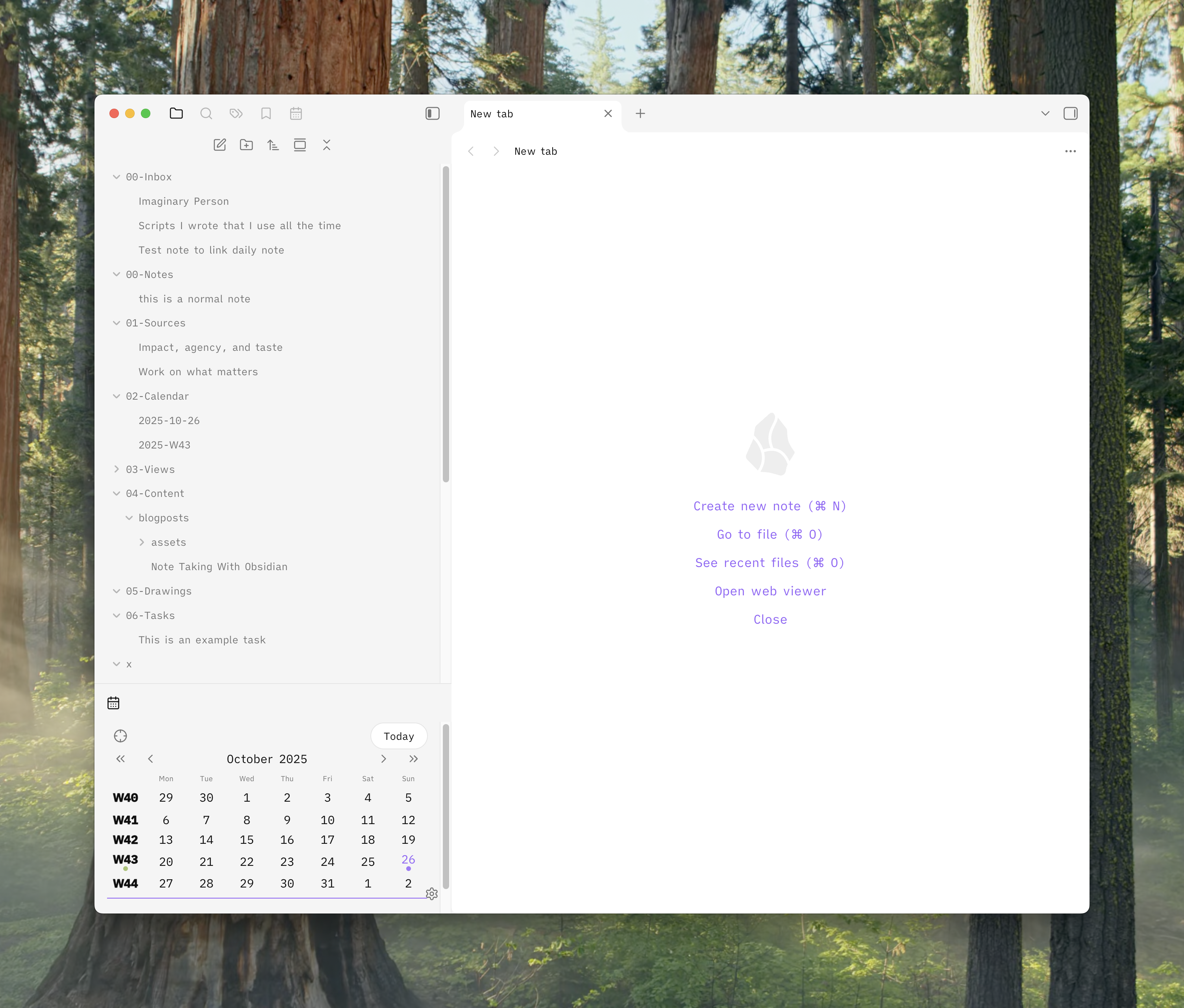 02-Calendar keeps all of the time related notes like daily, weekly, monthly, quarterly etc. The most frequent one I create are the daily notes. Others come and go.