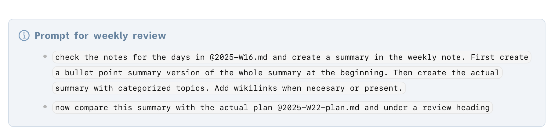 If my work becomes too hectic, reviewing daily notes and distilling the information can become time consuming. When that happens, I use the simple prompts below to summarize my week into a weekly note. Weekly note title contains the date interval. So LLM knows which notes it has to look